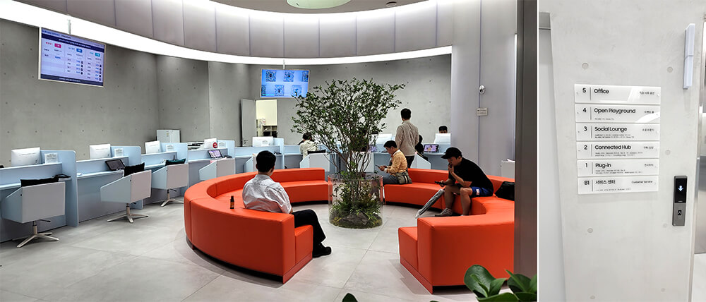 지하 1층부터 5층까지 있고, 지하 1층이 서비스 센터이다. 1층은 Plug-in이라고 층별안내에 표시되어 있고, 아트오브제가 크게 세워져 있고, 한켠에는 삼성 모바일과 웨어러블, 탭 등 제품들이 전시되어 있다. 2층은 구매상담, 3층은 소셜 라운지, 4층은 이벤트 홀, 5층은 직원 사무 공간이다.