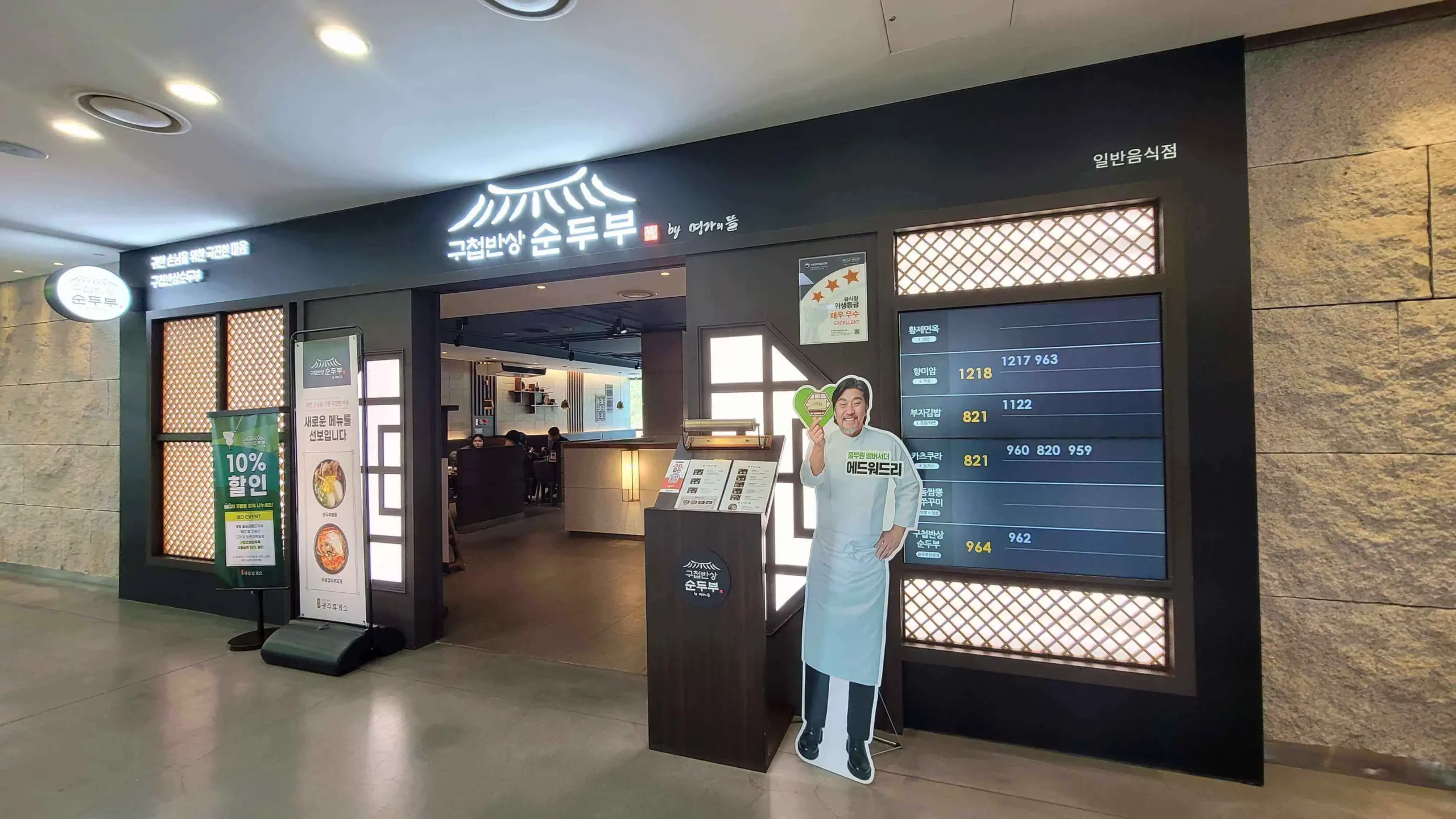 메뉴는 풀무원 순두부를 이용한 메인 요리로 정통순두부찌개, 해물순두부찌개, 전복새우순두부찌개, 백짬뽕순두부찌개 등과 선호도 높은 주찬, 시그니처 9첩 반찬을 기본으로 구성되어 있다. 메뉴판을 보면 순두부찌개 외에도 고등어구이, 곤지암식소머리곰탕, 불고기비빔밥 등 다양한 한식 메뉴가 있다.