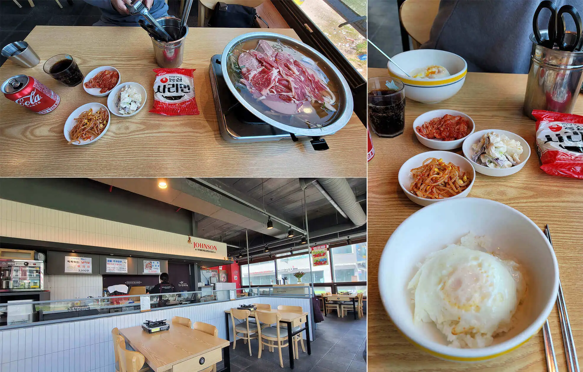 김포 고촌 존슨부대찌게의 햄가득부대찌게를 주문하니 밑반찬과 사리면이 나온다. 밑반찬은 김치, 콩나물, 사라다 이렇게 나온다. 밥이 나왔는데 대접안에 흰쌀밥에 계란후라이가 얹어져 있다. 너무 좋아. 필자는 입맛이 어린이 입맛이다. 계란후라이, 햄가득부대찌게 이런게 참 좋더라.
