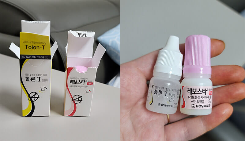 점안액과 먹는약을 처방받았다. 점안액은 레보스타 점안액과 톨론T 점안액이다. 레보스타 점안액은 항균 점안액이고, 톨론T 점안액은 각막염과 결막염등 염증 치료용 점안액이다. 먹는약은 항생제와 소염진통제, 만성염증, 피부질환, 기침, 알러지 질환에 먹는 소론도 이렇게 7일 분량을 처방 받았다. 복용한지 4일 지났고 어느정도 붓기는 가라 앉은 듯 하다.
