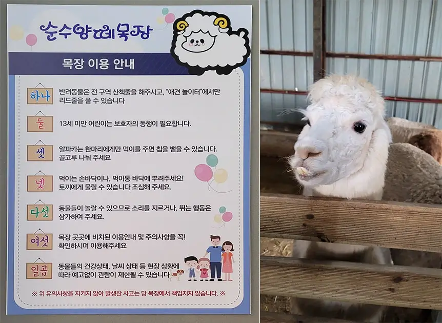 알파카가 침을 뱉는 광경에 대한 공지는 미리 입장권을 구매할 때 들어서 숙지는 하고 있었는데 막상 직접 들으니 웃기기도 하고 귀엽기도 하다. 너무 귀엽고 예쁜데 문제는 냄새다. 축사 안의 냄새는 각오를 하고 방문하길 바란다.