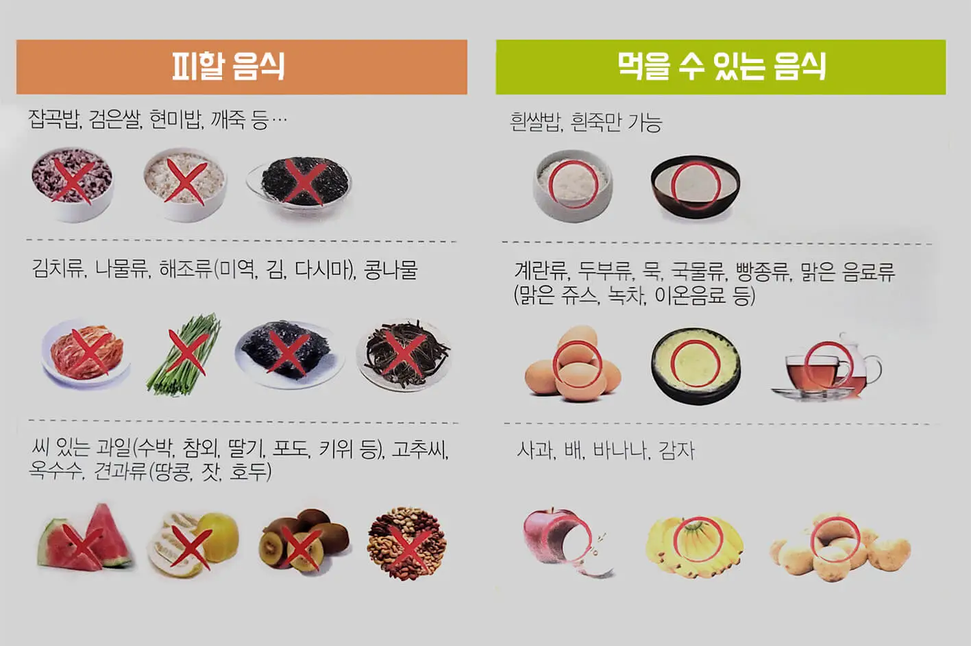 대장내시경 검사 1일전 식사방법을 살펴보자. 검사 1일전에는 아침과 점심 식사를 흰죽이나 미음으로 먹는다. 그리고 다음날 검사 시간대가 오전인 사람과 오후인 사람으로 나뉘는데, 오전에 검사를 받는 사람은 전날 저녁을 금식하도록 한다. 오후에 검사를 받는 사람은 전날 오후 4시에 죽을 먹도록 한다.