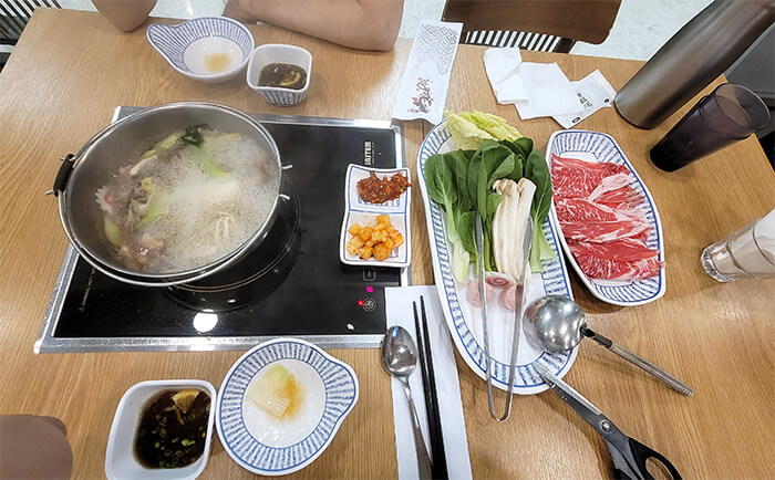 배추, 청경채, 버섯, 어묵, 떡 등의 야채가 조금씩 나온다. 여성 두명이 먹기에는 적당했으나, 남성 손님은 양이 적어 당황하는 눈치였다. 국물은 조금 싱거운듯 했는데, 자극적이지 않은 깔끔한 맛이었고, 계속 끓이면서 재료들이 우러나니 좀 더 깊은 맛이었다.