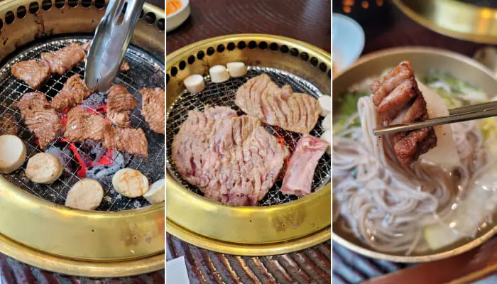 소고기샐러드에 나온 소고기는 짠맛이 강했지만 부드러웠다. 전 2종은 한가지는 육전이고, 한가지는 동그랑떙이었다. 이어서 숯불이 들어오고 설화한우양념모듬을 구워주신다. 얄팍하고 부드러운 한우양념 맛이 입안에서 고기와 함꼐 부드럽게 사라진다. 정말 맛있었다. 다 먹으니 남편이 메뉴판을 뒤적인다. 아직 나올 음식이 많은데 고기를 더 주문하려는 모양이다.