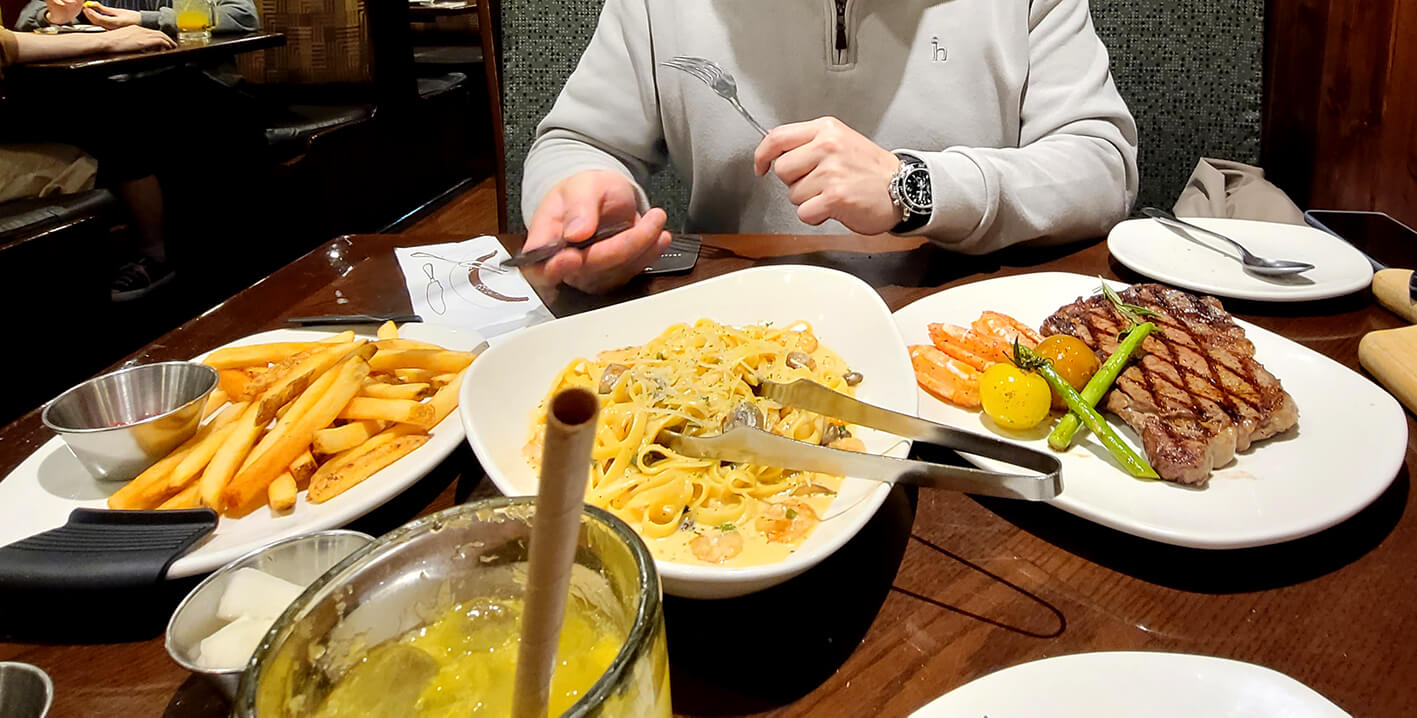 스테이크는 달링 포인트 스트립을 주문하고, 파스타는 영원한 사랑 투움바 파스타를 선택했다. 추가로 코코넛 쉬림프와 스프를 추가로 주문했다. 6명의 가족이 먹고도 남을 정도로 양은 충분했다.