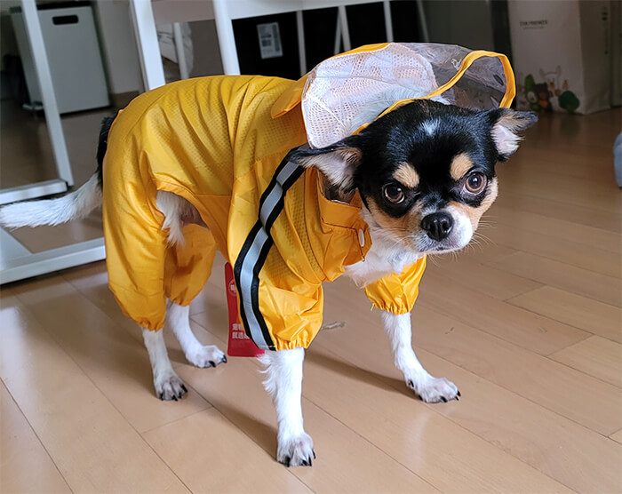 고민하던 끝에 올인원 제품을 사기로 마음 먹었다. 필자네 강아지는 덩치가 큰 치와와인데, 보통 티셔츠같은 경우는 라지사이즈를 입는다. 애견 우비를 라지를 보니 생각보다 옷이 너무 커보여서 미디엄 사이즈를 사왔다. 길이는 전체적으로 맞았지만 가슴둘레가 좀 꽉 끼는것이 아닌가. 늘어나는 재질이 아니다 보니 단추를 다 채우면 너무 답답해 보였다.