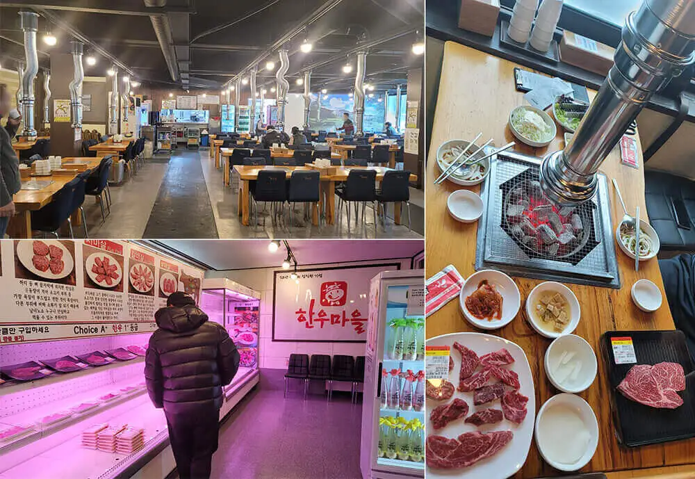 모두랑 한우마을은 정육점에서 고기를 골라서 테이블로 오면 된다. 테이블 세팅비는 대인 4,000원, 소인 2,000원이다. 우리부부는 1++등급 한우 꽃등심 238g, 1+등급 부채, 갈비, 채끝안심이 들어 있는 한우모듬 258g을 가져왔다. 상차림은 동치미, 무절임, 김치, 상추, 샐러드, 양파절임 등이 나온다.