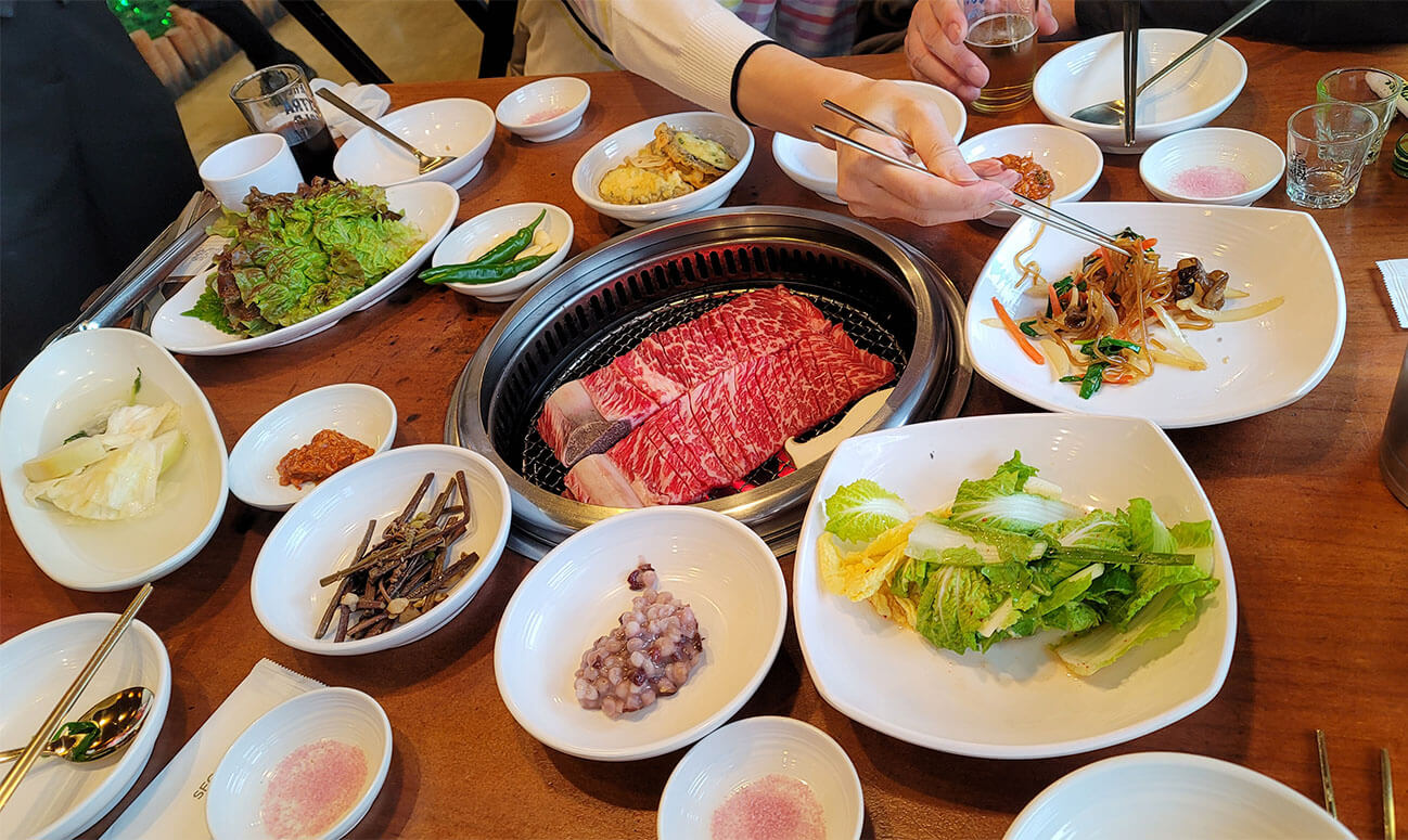 밑반찬으로 잡채와 가지튀김이 곁들여 나오는데 맛있었다. 가지튀김은 한번 더 리필해서 먹었다. 반주로 소맥을 오빠와 필자만 마시고 기분좋게 고기를 먹은 뒤 물냉면과 비빔냉면 그리고 된장찌게에 밥을 골고루 주문하여 같이 나누어 먹어봤다.