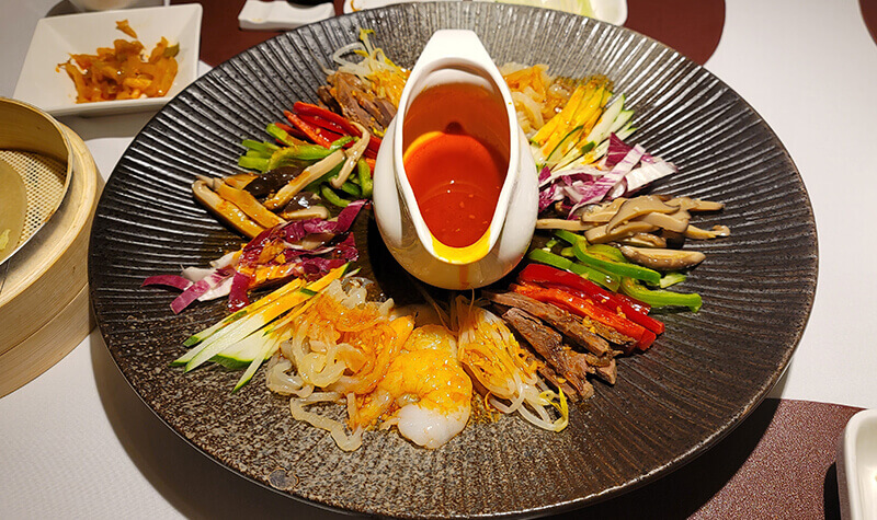 베이징덕은 면피에 오리껍질 또는 오리고기를 넣어서 오이와 파를 넣고 소스에 찍어 먹었다. 오리껍질이 맛있다고 하는데 바삭한 식감을 맛있다고 하는것 같다. 개인적으로 면피가 조금 더 얇으면 오리껍질의 맛을 더 느낄 수 있어서 좋을 것 같다. 오리고기는 약간 특유의 냄새가 나서 호불호가 갈릴 듯 한 맛이다.