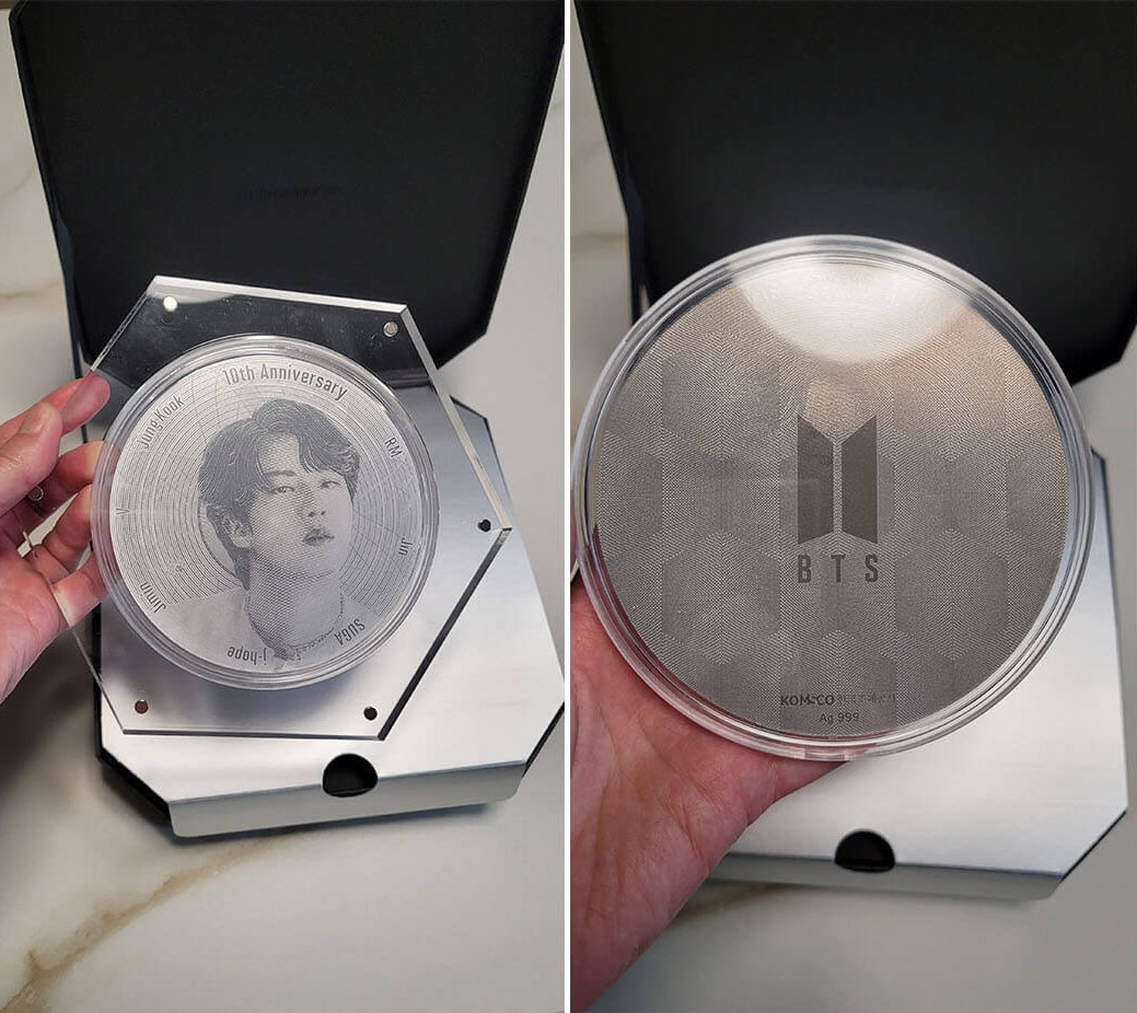 BTS 10주년 기념 은화 ‘진’ 메달은 22만원이다. 12.6g의 은화로 크기는 예전 CD만하다.